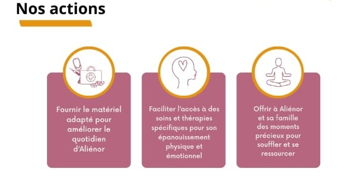 Aliénor est une petite fille, née en 2015, polyhandicapée à la suite d’une mutation génétique et totalement dépendante pour tous les actes de la vie quotidienne. Elle est nourrie par une gastrostomie et va en Institut Médico-Educatif (IME) la journée.